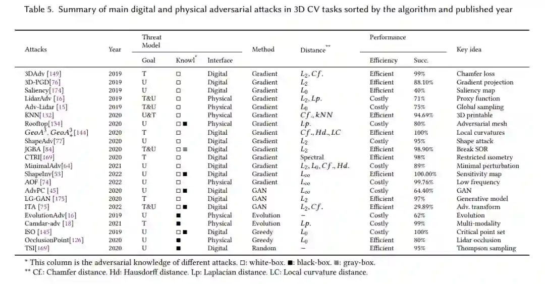 我们在表5中总结了3D数字和物理对抗性攻击的最新工作。根据用于生成对抗性示例的攻击算法,我们将3D对抗性攻击分类为以下几类: