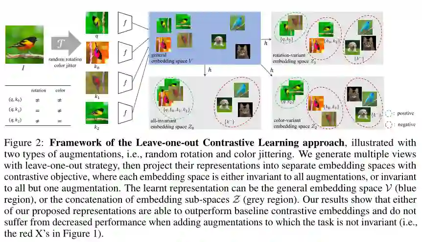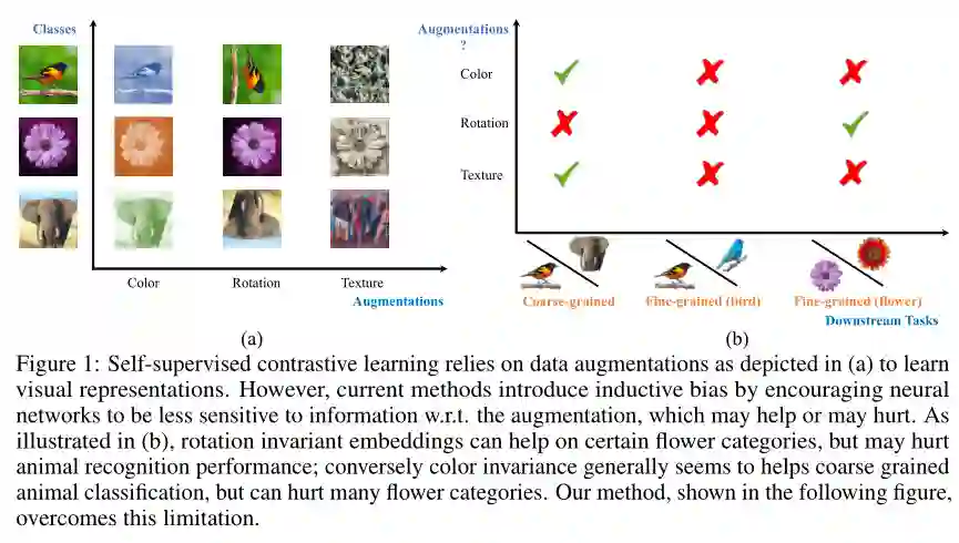 最近的自监督对比方法已经能够产生令人印象深刻的可转移的视觉表示通过学习对不同的数据增强保持不变。然而,这些方法隐式地假设了一组特定的表示不变性(例如,颜色不变性),并且当下游任务违反了这一假设时,它们的性能会很差(比如区分红色和黄色的汽车)。我们介绍了一个对比学习框架,它不需要特定的、任务相关的不变性的先验知识。我们的模型学会了通过构建单独的嵌入空间来捕捉变化的和不变的视觉表示因素,每个嵌入空间都是不变的,除了数据增强部分。我们使用一个共享主干的多头网络,它在每次扩展中捕获信息,单独在下游任务上优于所有基线方法。我们还发现,不变空间和变化空间的连接在我们研究的所有任务中性能最好,包括粗粒度、细粒度和较少的下游分类任务,以及各种数据破坏的情况下。