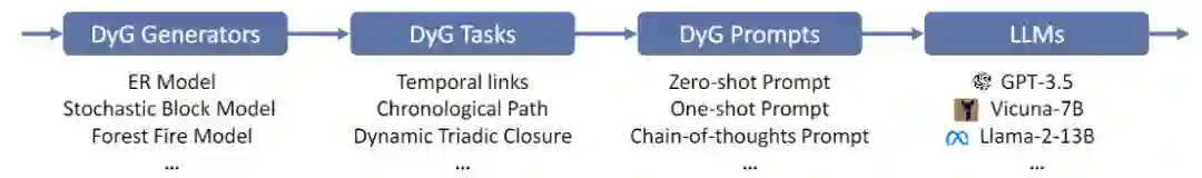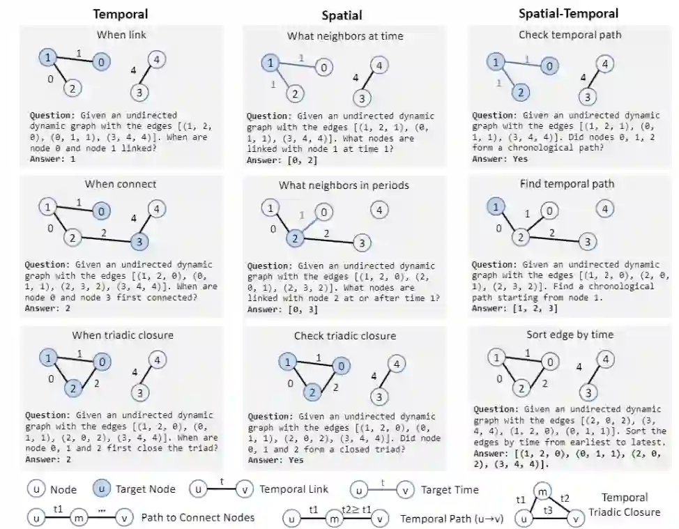 具体而言,我们针对性地设计了九个动态图任务,从时间、空间、时空三个维度评估大语言模型的能力,这些任务包括不同的时空模式(如时空连接、时空路径和动态三角闭合等)以及三类不同的问题:“何时”(when)、“在哪”(where)、“是否”(whether)。同时,还采用了: