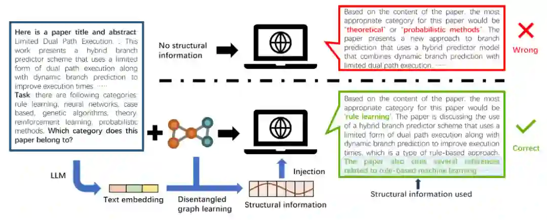 文本属性图(text attributed graph)在研究与应用上均非常普遍,例如引用网络、电子商务网络和社交网络等。最近,同样有不少研究将大语言模型应用于文本属性图。然而,现有方法仅通过提示将图结构信息传递给大语言模型,导致大语言模型无法理解图内部复杂的结构关系。针对该问题,我们提出了解耦图 - 文本学习(DGTL)模型,以增强大语言模型在文本属性图上的推理和预测能力。DGTL 模型通过解耦图神经网络层将图结构信息进行编码,使大语言模型能够捕捉文本属性图中隐藏结构因子间的复杂关系。此外,DGTL 模型无需对预训练大语言模型中的参数进行微调,从而降低计算成本,并适配于不同的大语言模型。实验结果证明所提出的 DGTL 模型能达到比最先进基线模型更优或相仿的性能,同时还可以为预测结果提供基于自然语言的解释,显著提高了模型的可解释性。