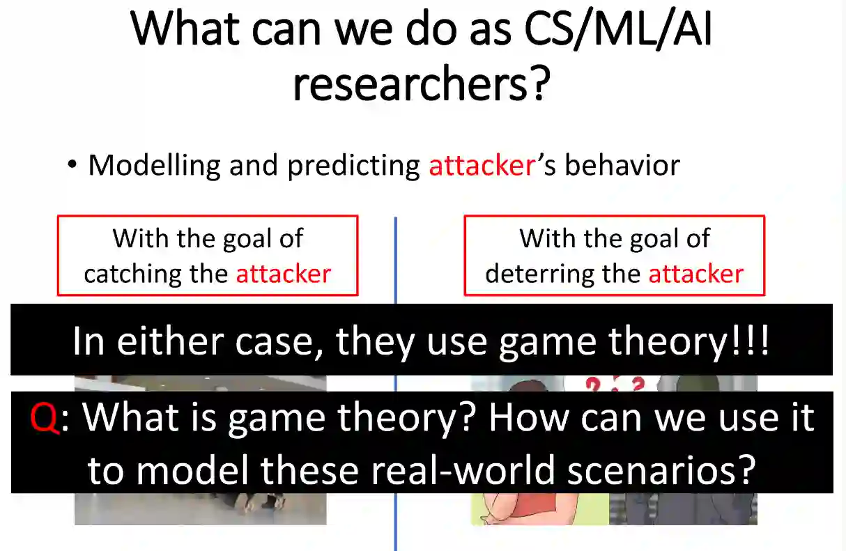 Fei Fang,卡内基梅隆大学计算机科学学院助理教授,电子邮件:feifang@cmu.edu。 方博士在多智能体系统上工作了七年多,专注于将博弈论和机器学习与应用程序集成到安全性,可持续性和移动性领域。她在绿色安全游戏和PAWS(野生生物安全保护助手)方面的工作在国际人工智能联合会议(IJCAI'15)上获得了计算可持续性轨道方面的杰出论文奖,并在人工智能创新应用中获得了创新应用奖。 她提供了有关计算游戏理论主题的教程,包括AAMAS 2019计算游戏理论教程,IJCAI 2018游戏理论和安全性机器学习教程,AAMAS 2018 AI促进社会公益教程以及ACM-EC 2017关于进步的教程安全与隐私的博弈论。