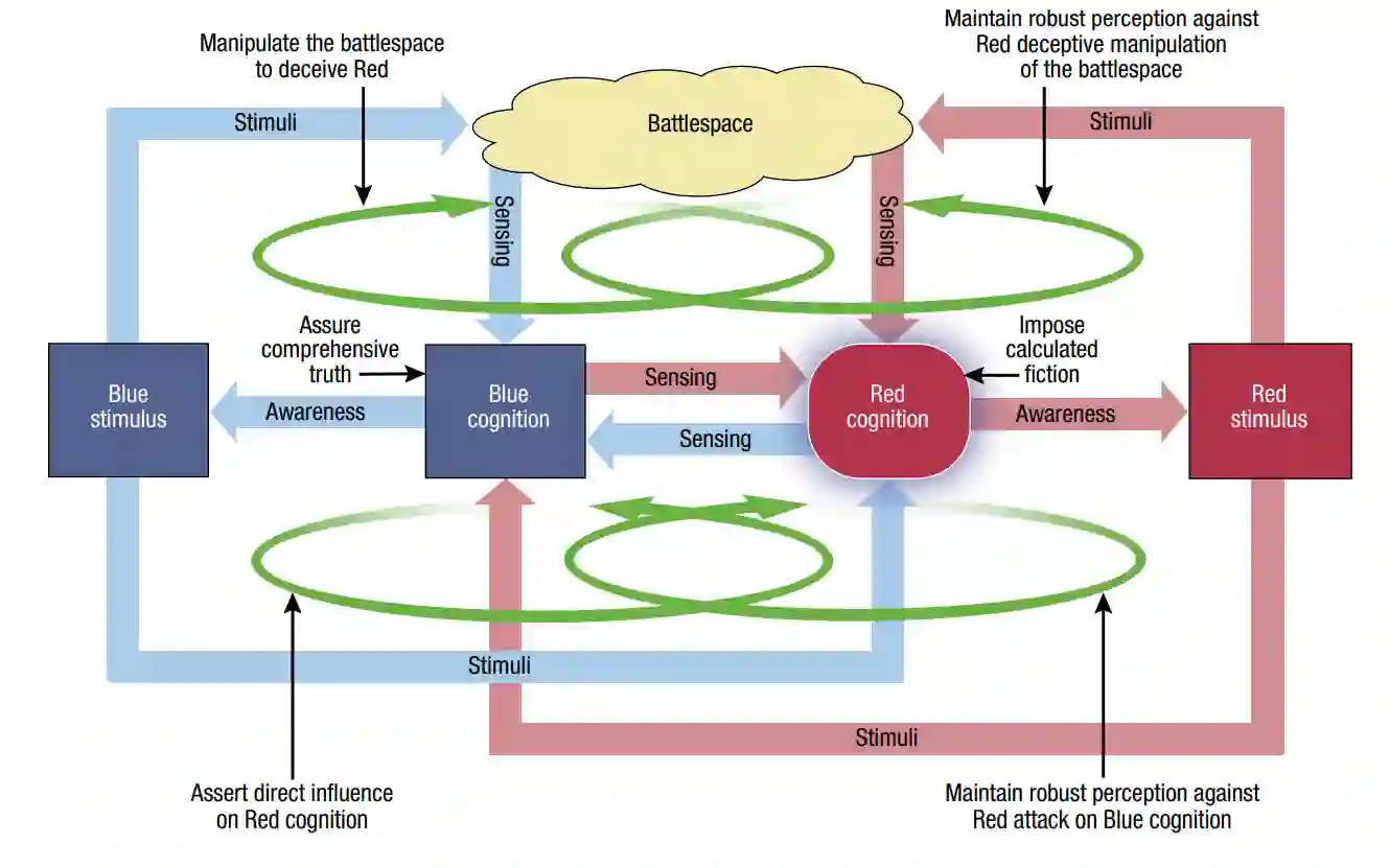 图6. CUTI的概念。图中显示的是这个概念中的四个相互交织的过程,或称循环。右侧反映了蓝方部队试图保持对战斗空间的全面看法,并保持对红方直接攻击蓝方认知或感知的企图的了解和战胜。左侧反映了蓝方试图控制红方的感知。