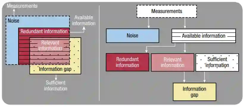 图4. 信息差距的说明。信息差距被定义为相关信息(粉色)和充分信息(虚线)之间的差异。相关信息是可用信息(带状)和冗余信息(红色)之间的差异。可用信息是从噪声测量中提取的。