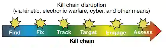 APL目前正在开发旨在为美国及其盟国提供破坏对手杀伤链的能力的技术。杀伤链要素的标准描述见图2。杀伤链通常从寻找目标并在空间和时间上定位(或固定)它们开始。然后必须对目标进行监视,以足够的精度跟踪其位置,以便进行瞄准和交战,随后进行评估,以确定可能需要重新交战。一个特别工作组研究了73种选择,以利用对手C5ISRT杀伤链在反介入、区域拒止环境中的弱点。这些选择被归类为动能、电磁战或网络行动。在2012-2018年的时间框架内,APL的独立研究和开发(IRAD)项目对其中一些选项和其他选项进行了调查。这些调查证实了攻击对手C5ISRT的特定技术的潜力,并导致了一系列赞助商资助的任务,这些任务正在推进选定方法的技术准备。
