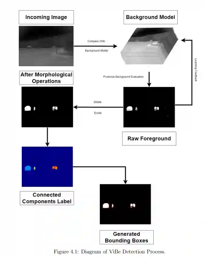 本研究回顾了与目标检测、红外光谱中的目标检测和数据融合相关的文献。使用 DBIR 数据集进行了两组实验: 运动检测和基于 CNN 的目标检测。在运动检测方面,开发了视觉背景提取器(ViBe)的并行执行,采用 ConnectedComponents 分析生成边界框。为了评估这些边界框,进行了交集-联合(IoU)计算。结果表明,在摄像机视场保持静止的序列中,DBIR 在 6.11% 的情况下增强了边界框的 IoU。尺寸分析表明,ViBe 在检测该数据集中的小而暗的目标时非常有效。