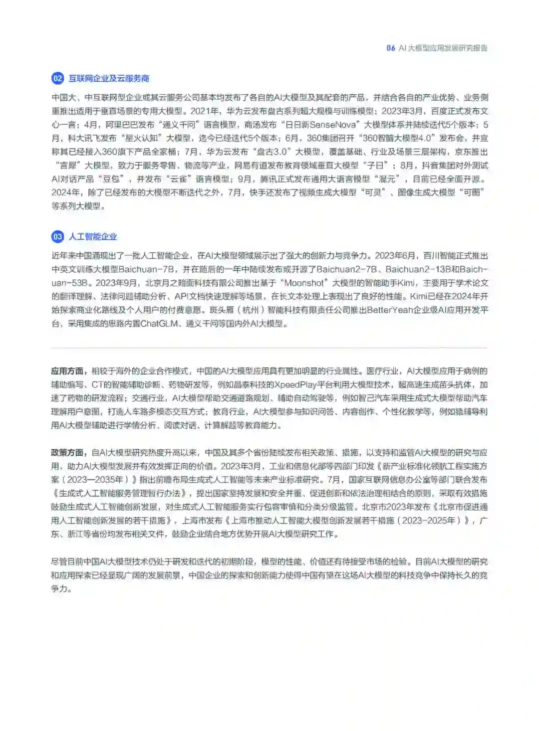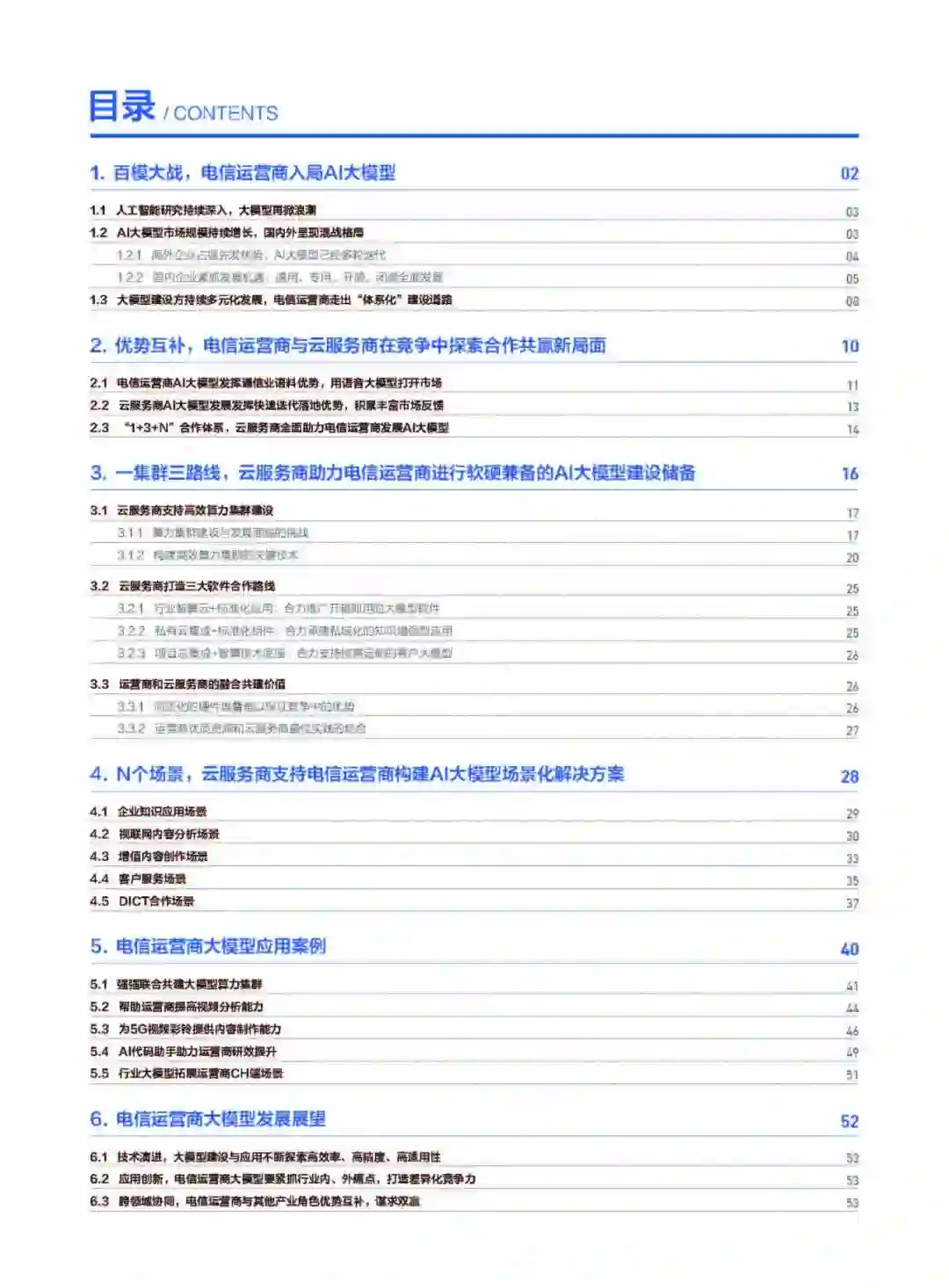 《2024年AI大模型应用发展研究报告》深入探讨了AI大模型在电信行业的应用前景,特别是电信运营商与云服务商在该领域的合作机会。报告指出,随着AI技术的快速发展,大模型已成为推动行业创新的关键因素。电信运营商凭借其丰富的数据资源和网络基础设施,与云服务商的技术优势相结合,共同探索AI大模型的多元化发展。**报告提出了“1+3+N”合作体系,即围绕一个算力集群,通过三条技术路线(标准化软件研发、标准模型能力强化、定制化模型精调)和多个应用场景,推动AI大模型在企业知识管理、视联网内容分析、增值内容创作和客户服务等领域的应用。**此外,报告还对AI大模型的未来发展趋势进行了展望,强调了技术创新、应用创新和跨领域协同的重要性。