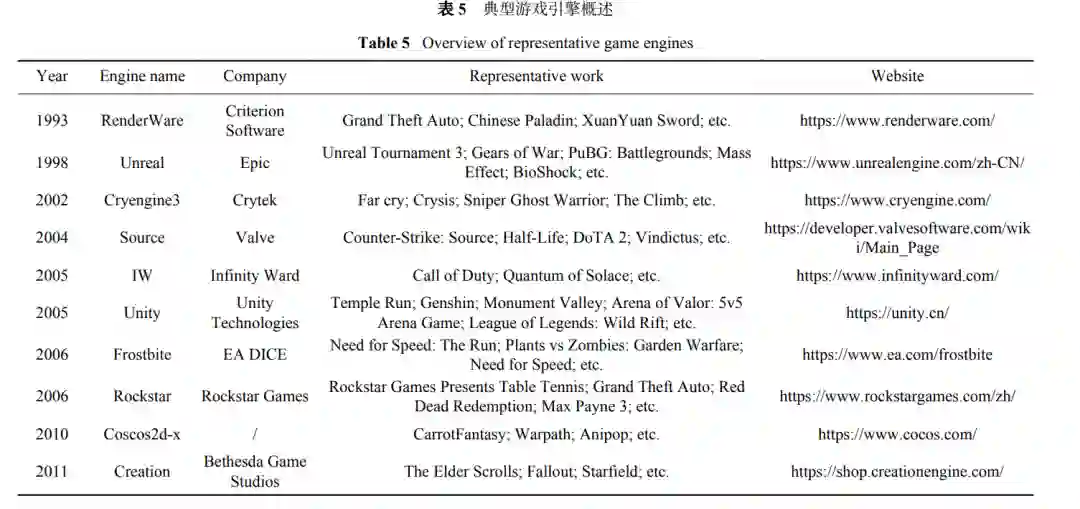 电子游戏技术,是元宇宙的最直观的表现方式,不仅可以为元宇宙提供内容创作平台,还可以实现娱乐、社交场景的聚合。元宇宙产品实质是游戏的泛化(娱乐游戏、严肃游戏等),比如,美国著名歌手Travis Scott在《堡垒之夜》举办元宇宙演唱会;GUCCI与Roblox推出的“元宇宙GUCCI品牌展览会”;欧莱雅发布的全球首个品牌虚拟代言人“M姐”等等。游戏开发中,最重要的是游戏引擎,类似于制造机床的母机床,这也将是大规模元宇宙平台的“卡脖子”技术之一。游戏引擎的出现降低了游戏设计者及开发者建立虚拟场景的难度,使他们无需从基础的代码做起。其发展决定了元宇宙中NPC建模、场景实时渲染、用户操作与交互等方面的质量及性能,让用户有更加接近于真实世界的体验。目前,比较知名的游戏引擎如表5 所示。