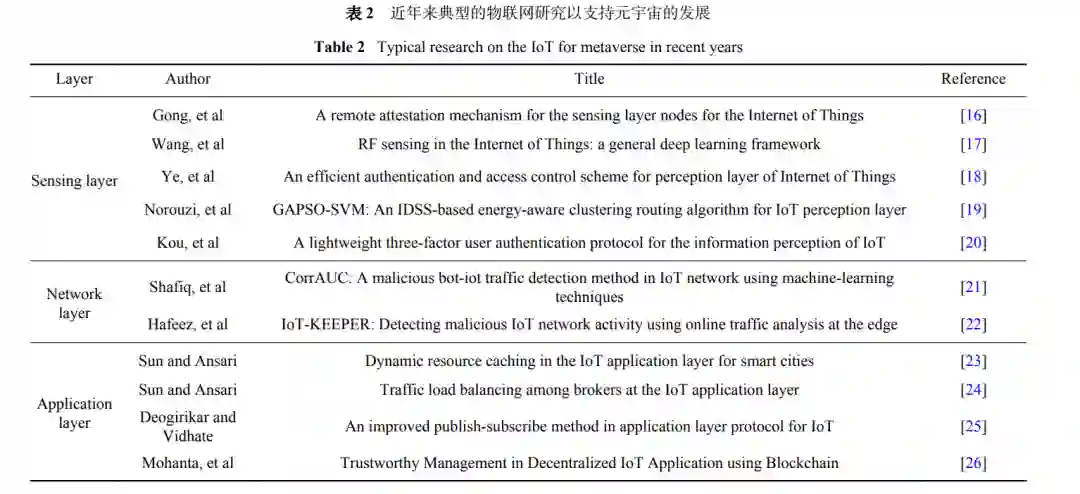 物联网(Internet of Things, IoT)在元宇宙的网络基础设施的实现和发展中将发挥重要作用。虚拟世界与现实世界的泛在连接,离不开大量传感器、智能终端等物联网设备实时采集和处理数据,故物联网可为用户提供真实、持久且顺畅的交互体验,是虚拟世界与现实世界的联接和桥梁。物联网经典的三层架构,即感知层、网络层和应用层,与元宇宙的建立紧密联系。表2 列举了近年来部分学者对物联网三层架构的研究成果,将来为物联网技术在元宇宙中的应用做好铺垫,支撑元宇宙的发展。