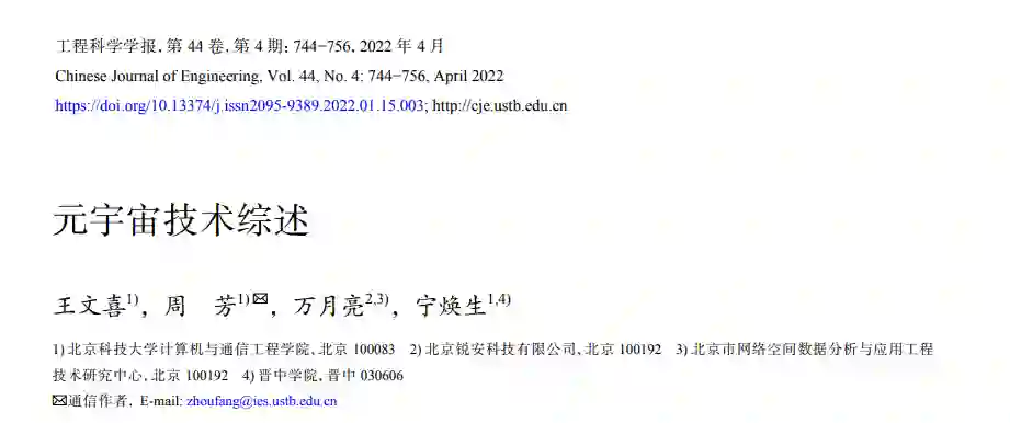 摘要: 元宇宙作为一个新兴的概念受到了产业界、学术界、媒体界及公众的广泛关注,国内外众多公司也纷纷在“元宇宙”领域布局,但布局的背后离不开强大的技术支持。本文从技术维度深入剖析元宇宙。首先,从科学与技术的角度论述元宇宙的概念及内涵,并总结了目前从业者、专家以及学者对元宇宙的不同见解。其次,概述了元宇宙相关关键技术,包括网络及运算技术(5G、6G、物联网、云计算、雾计算及边缘计算)、管理技术(能耗管理、资源管理、会话管理及时空一致性管理)、虚实对象连接、建模与管理技术(X联网、身份建模、社会计算、去中心化管理技术)、虚实空间交互与融合技术(拓展现实、电子游戏技术、脑机接口技术)等。元宇宙不宜称为新技术,而是IT新技术的综合运用。技术的进步与发展,将为元宇宙的实现和应用奠定坚实的基础,同时元宇宙的发展也会促进现有技术的升级换代。最后,展望了元宇宙发展面临的诸多挑战,以清晰认识、理智决策、稳步探索元宇宙。