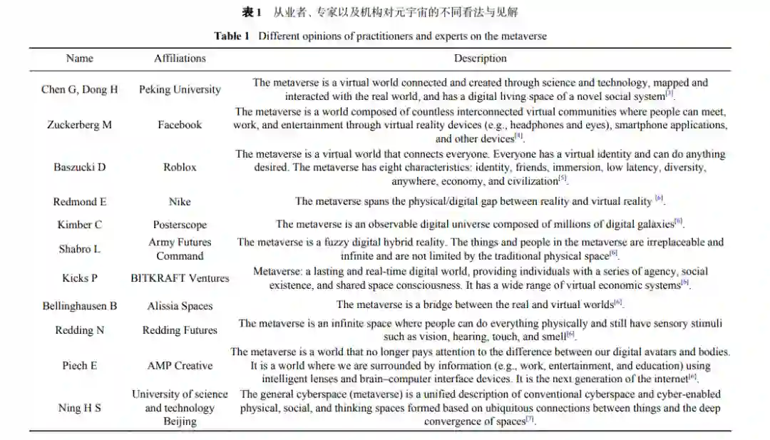 元宇宙作为一个新兴的概念,受到了产业界、学术界、媒体界及公众的广泛关注,但对于元宇宙的定义及概念还不够统一和明确,不同从业者、专家以及机构给出了对元宇宙的见解,如表1所示