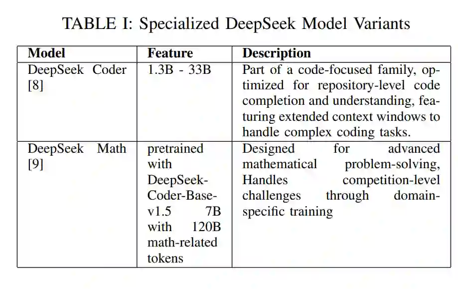 DeepSeek MoE-16B是一个160亿参数的MoE模型,每个令牌仅激活26亿参数,通过动态路由输入通过16个专家网络中的2个。这种稀疏激活将推理成本降低了70%,同时保持了与类似大小的密集模型相当的性能。它在涵盖代码、数学和通用文本的多样化数据集上进行了预训练,专注于高质量数据和专家专业化,以处理代码生成和数学推理等任务。表I展示了其他基于DeepSeek的专用变体。