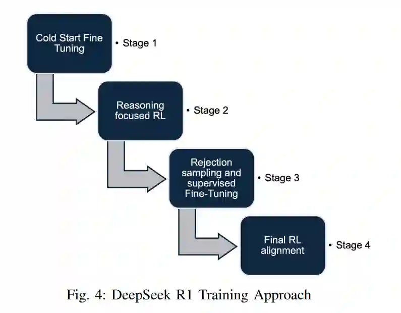 DeepSeek R1顺序生成令牌,并通过生成思考令牌来阐明其推理过程,从而为问题解决分配额外时间,如图3所示。其训练管道包括以下步骤,如图4所示:
