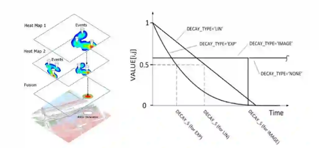 图3:融合方法的基本概念(左),作为使用两个加权分布图(热力图)的例子。应用不同的衰减函数(右)来建立加权分布图的时间动态行为。