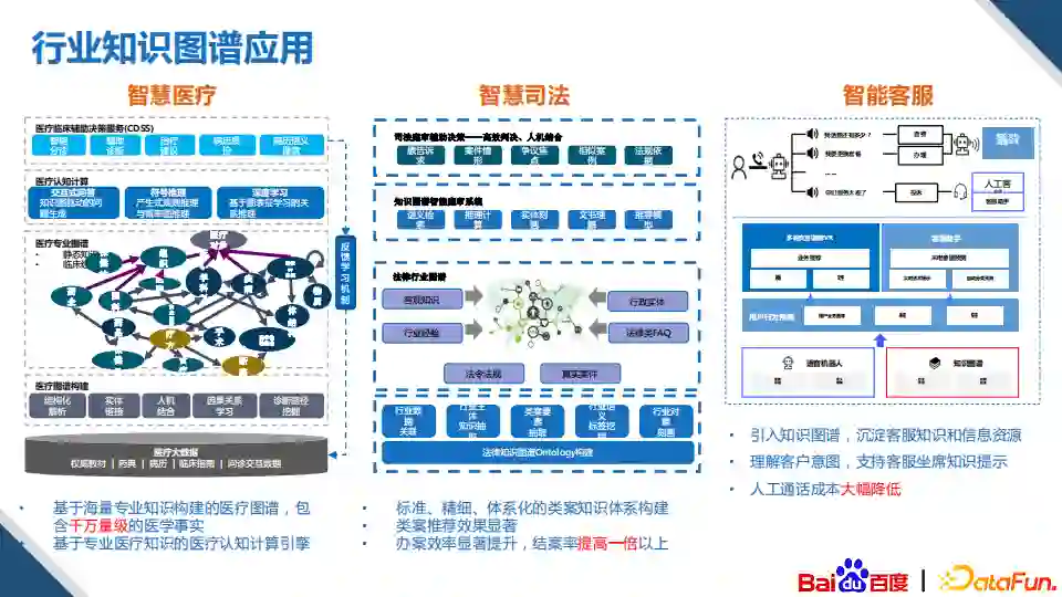 首先是基于海量专业知识构建的医疗知识图谱,其包含了千万级的医学事实,并开发了基于专业医疗知识的医疗计算认知引擎,在多家三甲医院上线使用; * 其次是智慧司法,我们完成了标准、精细、体系化的类案知识体系的构建,类案推荐效果显著,在法案实际的使用当中,结案的效率提高了一倍以上; * 最后是智能客服,我们引入知识图谱,沉淀客服知识和信息资源,通过理解客户的意图,支持客服坐席的知识提示,人工通话的接单量降低了70%。