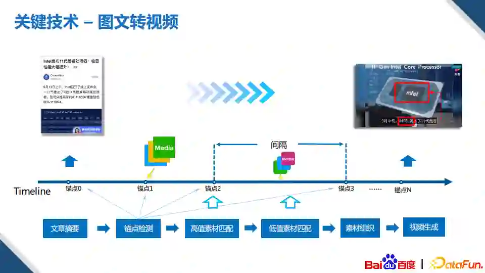 图文转视频的过程大概可以分为以下步骤: * 首先生成文章摘要,文章一般来说都是包含数百上千字的内容,但是资讯类的视频长度可能在30秒到100秒左右,因此我们需要进行摘要; * 其次需要对摘要后的文本进行锚点选择,锚点就是摘要后的一些比较关键的信息片段,比如上图例子中“英特尔”就是一个比较关键的锚点,这样做主要的原因是生成视频的素材输入大部分情况下都很少,比如可能就2-3张图,我们要把最相关的素材给到用户关注度最高的时间点上; * 对于这些关键信息出现的时间点,需要有对应的高相关的素材进行展示,比如上述例子中的,当语音说到“intel”的时候,视频展示的是文章里面的包含intel的配图,如果文章中无对应的高相关性的图片视频素材,那就通过检索关联,从知识图谱中获取对应的信息; * 对于非锚点的时间区间,可以使用文章中的其他低值素材作为填充,同样地,如果无素材,则从知识图谱中获取相关素材; * 最后,使用视频生成引擎进行视频的渲染。