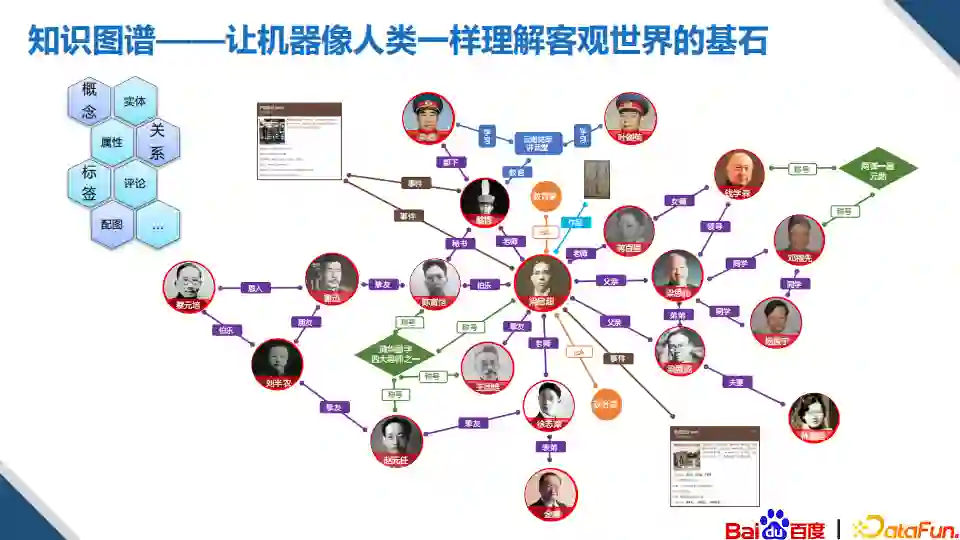 知识图谱以结构化的知识来描述客观世界的概念、实体及其属性和关系。从上图例子中我们可以看到,和梁启超相关的一些概念和关系,比如教育家和政治家是和梁启超相关的一些身份概念,而梁启超和梁思成是父子的关系。