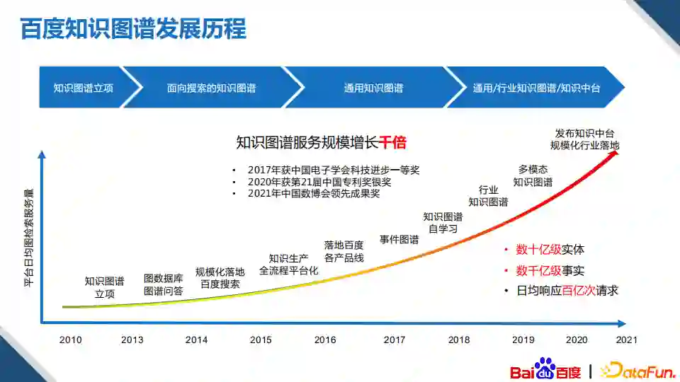 第一个阶段在2013年以前的Pre-KG阶段,这也是学界和业界知识图谱发展的初级阶段,百度的知识图谱立项并开始运用于百度知识搜索的知心产品; * 第二阶段在2014年至2015年,是知识图谱方法论和架构逐渐成型的阶段,我们建立了垂类的领域知识库,并规模化地应用于搜索的各类产品之中; * 第三个阶段在2016年至2017年,逐渐地深入建设通用知识图谱相关的架构、算法和机制,开始全面应用于搜索、金融、客服、商业等各类产品线; * 第四个阶段在2018年以后,这一阶段,技术建设的重点在于多元知识图谱的异构互联、图谱的主动输入和自学习、多媒体知识、复杂知识以及行业知识图谱的理解与构建等。