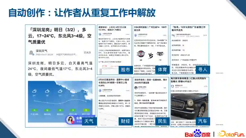 首先是智能自动创作,通过数据加自动写作引擎的方式,实时大量地生成覆盖多个领域的资讯,让创作者从重复的工作中得到解放。像天气文章,每天都需要在规定的时间内高效地发布数千篇文章,单纯人工很难完成这些工作。