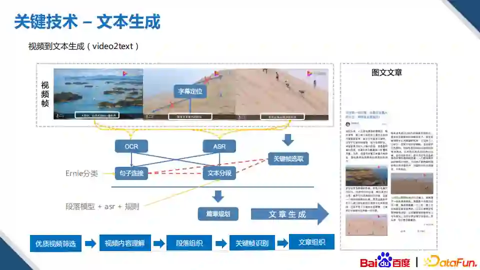 视频到文本的生成方式,应用场景有很多,比如大家比较熟悉的视频会议记录,就是一种,当然了它们是不同的研究范畴。对于视频转图文,我们的主要目标是希望生成的文章能够很好地表达视频的内容。 我们目前的方法当中会同时使用模型和规则。首先是做视频的理解,得到视频的一些感知数据,像ocr、asr相关的信息,为了确保文章的准确率,我们会使用ocr和asr做一个双向的校验,对输出的字幕会使用Ernie进行分类,最后结合每一段去选择对应的关键帧作为图片。有了文本和对应的关键帧作为配图,就可以按照这种时间的逻辑顺序生成一篇视频转写的文章。