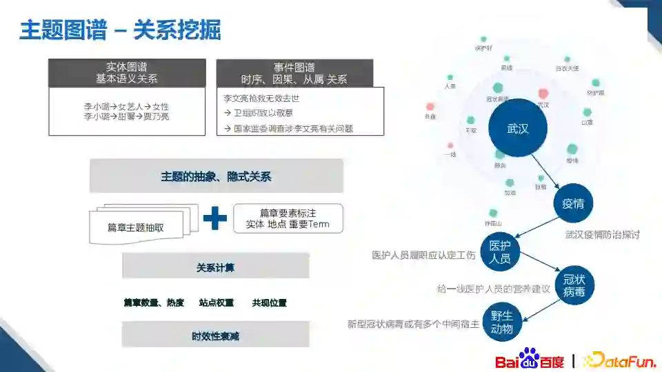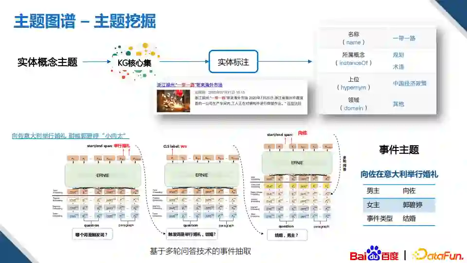主题分为实体主题和事件主题,他们的挖掘方式各有不同。 * 实体主题:我们以百度的核心集为基础,通过实体概念标注,从各种资讯中挖掘出实体概念主题,并抽取和计算每个主题的属性。 * 事件主题:我们通过对客观世界发生的事件,通过对篇章进行阅读理解、问答的方式来抽取出事件主题。事件抽取策略通过百度ERNIE—基于知识增强的语义理解模型进行多轮问答技术来实现的。