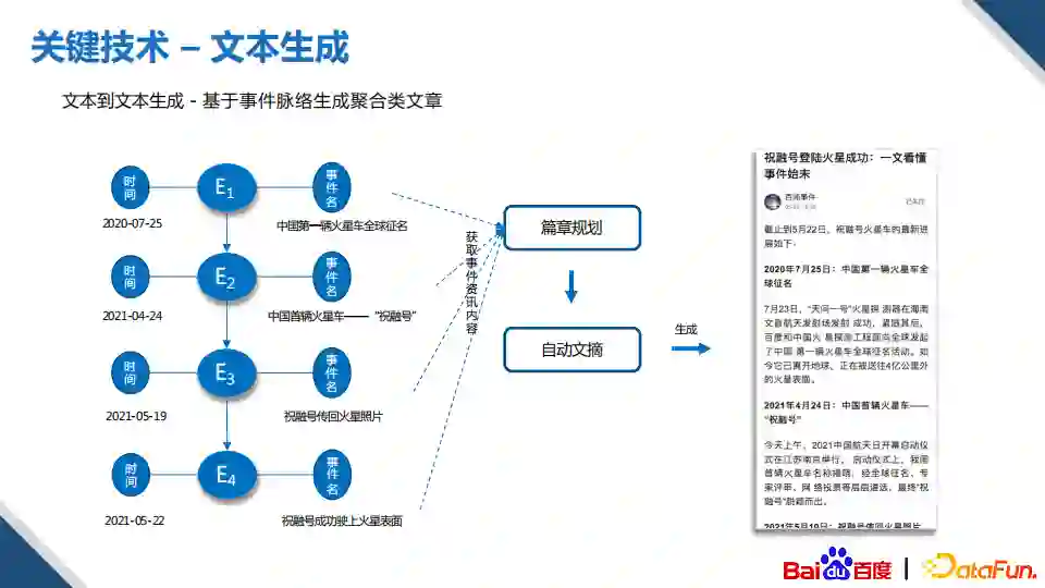 有了图谱信息和摘要生成技术,就可以做很多类型的文章了,比如上图的文章,它是一个事件脉络追溯的文章,把中国的第一辆火星车“祝融号”的来龙去脉进行了一个非常详细的盘点。