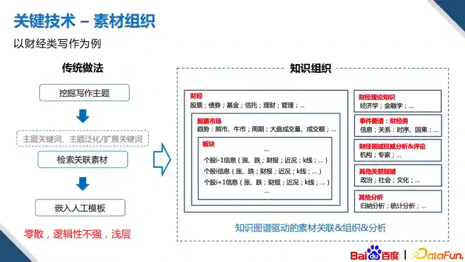 有了话题,接下来就是如何去组织文章的素材,在传统的做法当中,当挖掘出写作的主题之后,一般是直接检索关联的素材,嵌入模板就结束了,这种方案是比较浅层的,整体的文章逻辑非常零散。在我们的做法中,首先对素材包含的知识进行分析整合,形成一个体系化的知识信息,在生成文章时,将该知识信息结合图谱中其他的相关联的知识同时作为输入,这样生成的文章内容上会更加丰富,文章的整体性逻辑会更强。