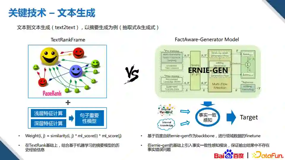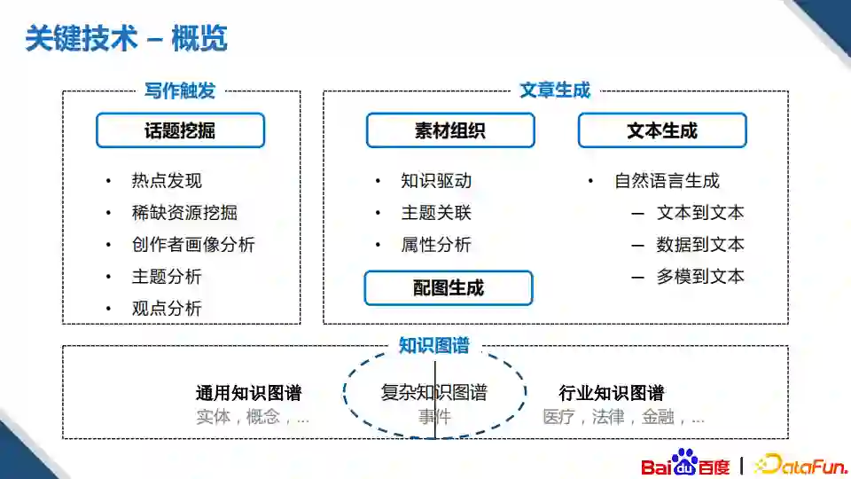 在技术概览当中,我们可以看到无论是写作触发,还是文章生成,底层都需要依赖于知识图谱作为输入,上层比较依赖于两个重要的技术方向,一个是理解,另外一个是生成。 下面分别介绍具体关键技术: