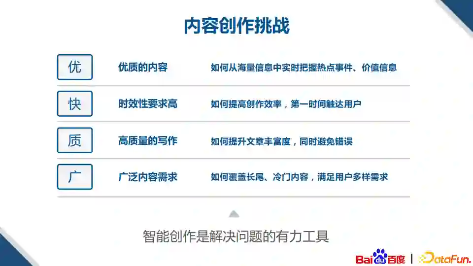 创作,是对人类现有知识和素材的组织和再创造。在内容创作领域,像媒体、金融、政企都有大量的创作需求,比如新闻稿件、金融报告、公司公文等。在创作时一般都有以下四个痛点: * 第一是如何从海量信息中获取到有价值的内容; * 第二是时效性要足够高,像新闻稿件尤其是热门事件的新闻,肯定是越快越好; * 第三是要把控内容的质量,避免出现错误; * 第四是内容覆盖要广泛,包括长尾和冷门领域。
