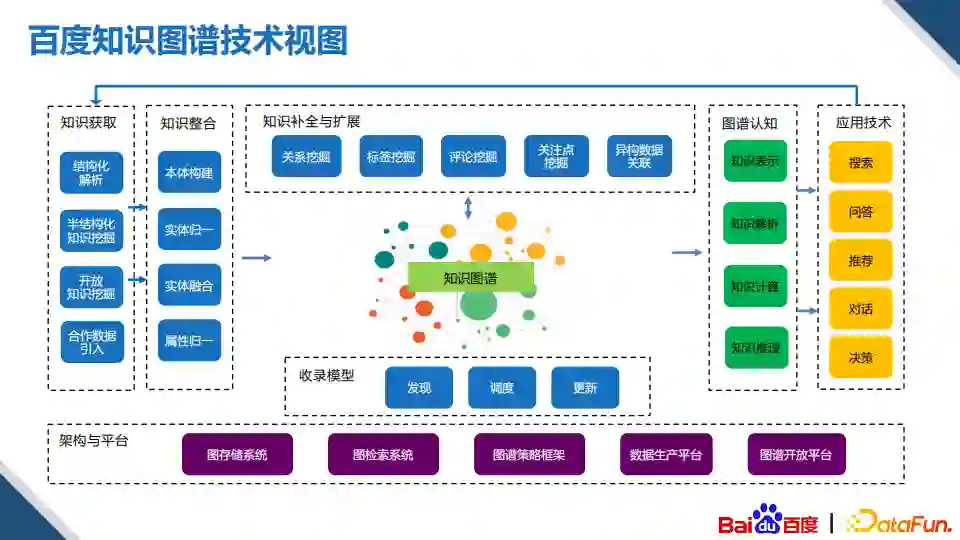 上图为百度知识图谱技术视图,首先是知识获取技术,即各种信息抽取的技术;接下来是知识整合技术,用于多元知识的融合;然后是知识补全和扩展的技术,用于不断地丰富知识图谱的内容;知识表示学习、知识推理与计算等认知技术主要运用在搜索、推荐问答等业务当中;最后,收录模型可以持续高效地更新知识。最下面是支撑上面所有知识发现、组织与获取应用能力的架构和平台。