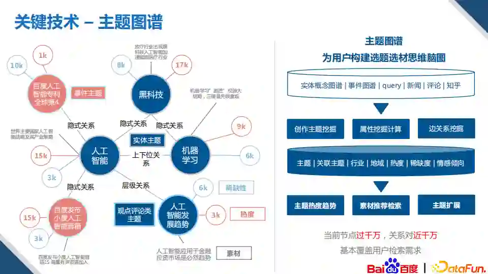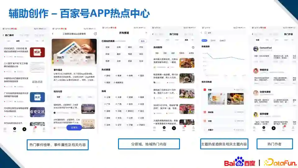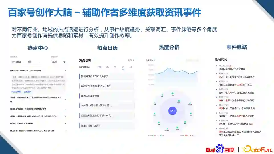辅助方面,在公司内部,我们支持了百家号APP的多项创作能力,例如热点分析、热门推荐、主题趋势等。