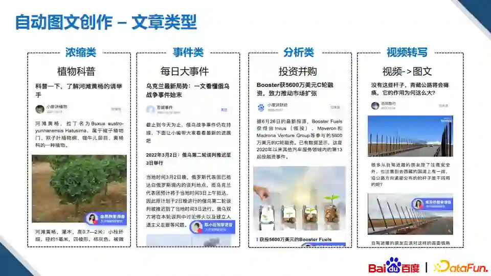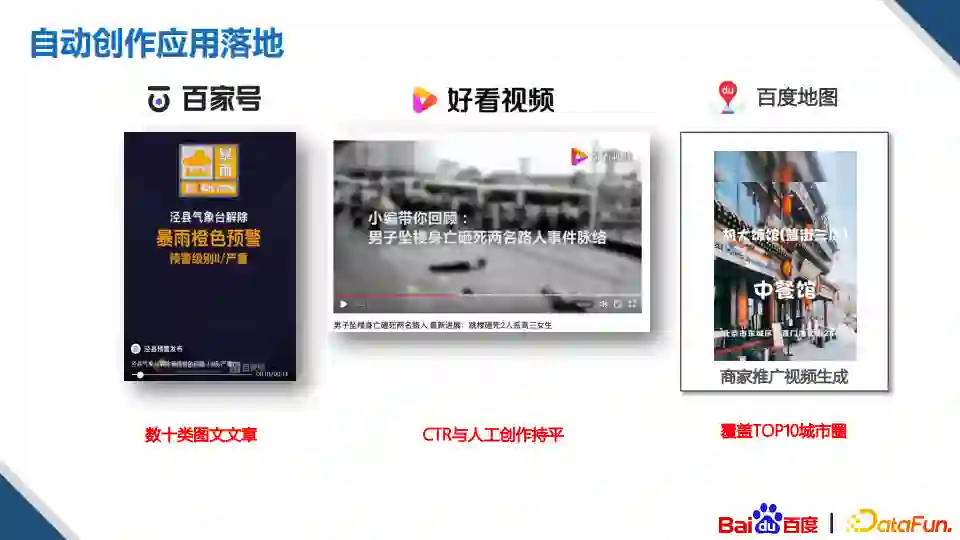 自动创作方面,我们在百度百家号落地了数十类的图文文章,借助视频创作引擎,我们在好看视频也落地了多种类型的视频作品,CTR达到了与人工创作持平,同时在百度地图落地了商家推广的视频产品。