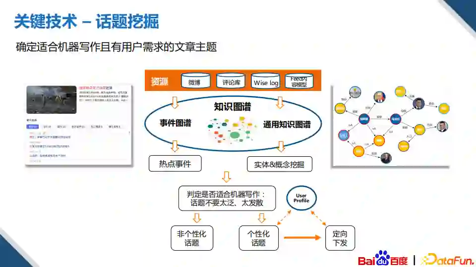 有了图谱作为基础,接下来就可以从全网域的数据中获取一些相关的咨询信息;然后我们从通用的知识图谱当中获取到对应的资讯中的实体概念,从事件图谱当中获取与资讯对应的的热门事件;接着再对这些概念和资讯进行进一步的分析和理解;最后依据写作类型,分别确定哪些话题可用,就可以得到我们的写作话题。