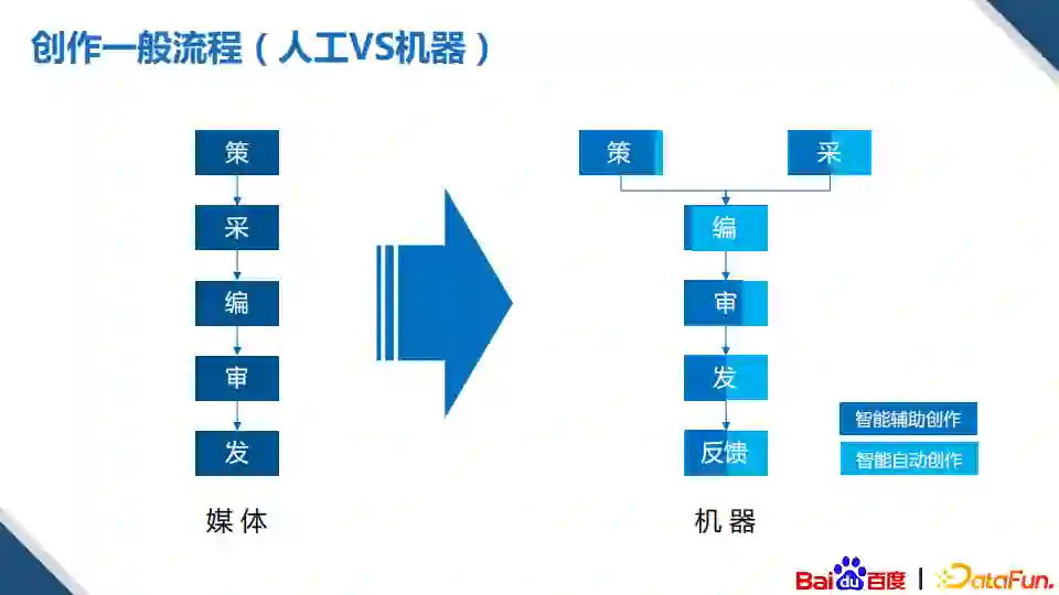在介绍核心技术前,先看下机器创作和人工创作的区别,以媒体为例,创作过程一般有五个部分,分别是策、采、编、审、发。具体来讲,策是策划、要写什么,采是根据要写的主题去找相关的素材,编则是根据找到的素材写文章或制作视频,然后是审核和发布。机器创作分别扮演着不同的角色,比如自动创作这个线条,其主要侧重点是在于采和编辑;而辅助创作这个线条,侧重点就在于采集、策划和审。