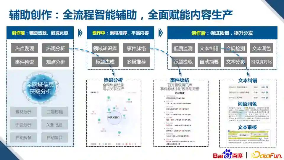 于是,我们同样打造了智能辅助创造的能力,从创作前的素材的采集、理解,给作者提供热点的发现、热词分析的能力,到创作中的素材的推荐、编排,再到创作后的质量检测、提升,全流程的提供辅助创作的功能。自动和辅助的相结合,可以实现效率与质量的双收。
