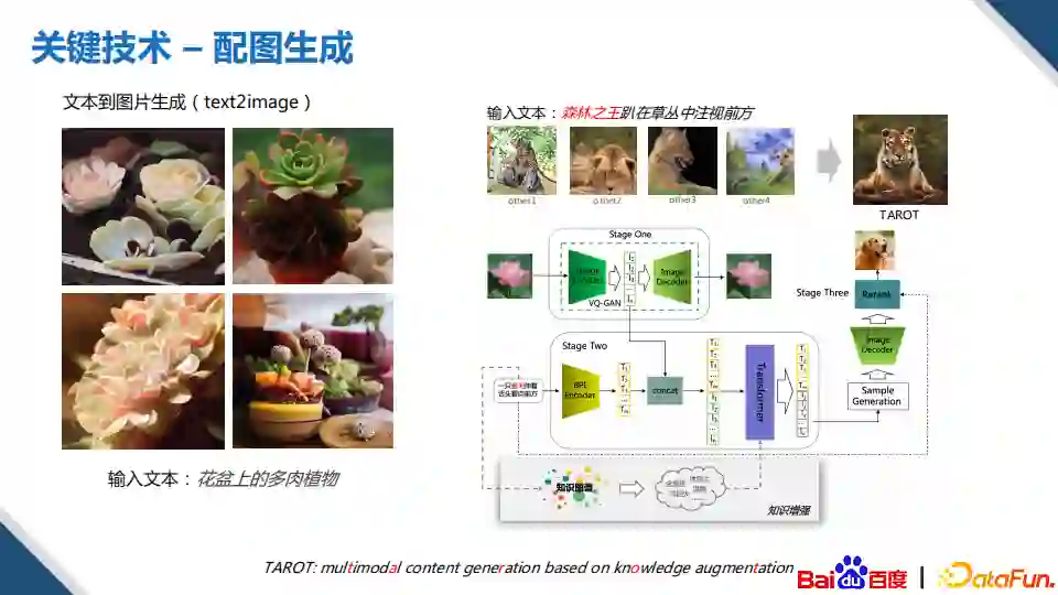 除了文本生成,我们还探索了文本到图片生成,这是一个非常有应用价值的技术,它除了可以生成各种类型的图片,还能够帮助公司去避免图片版权相关的一些问题。对这方面技术了解的同学,应该都看过DALL·E的生成效果,可以说是非常惊艳的,但仍存在一些问题,比如图片分辨率较小,图片质量不是特别高,所以是不可以直接落地使用的。另外,在真实的场景下,作者检索图片时,输入的往往都是概念,而DALL·E更偏向于对确定性实体进行细节性描述。所以我们的做法是,首先使用VQ-GAN代替了DALL·E的VQ-VAE,并且提高了图片生成的分辨率。上图多肉植物图片,可以看到,质量是非常高的;然后结合知识图谱让模型学习到更多的和抽象概念相关的知识,保证模型能够理解人类常识性的概念,在右上角这个示例中,可以看到,当输入的是“森林之王”时,模型依然可以很好地生成对应的实体,而且质量上相对也更好。