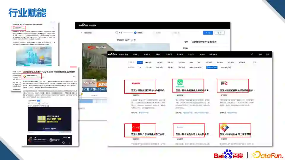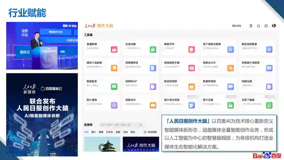 在行业赋能方面,自动创作上,我们和国家预警中心,中国天气网等部门进行了深度的合作;辅助创作上,我们支持了四川观察新闻视频的拆条和主题抽取的应用,以及多家省级媒体的辅助能力的落地。此外,在去年初我们还和人民日报达成了持续的合作,输出了多项创作的核心能力。
