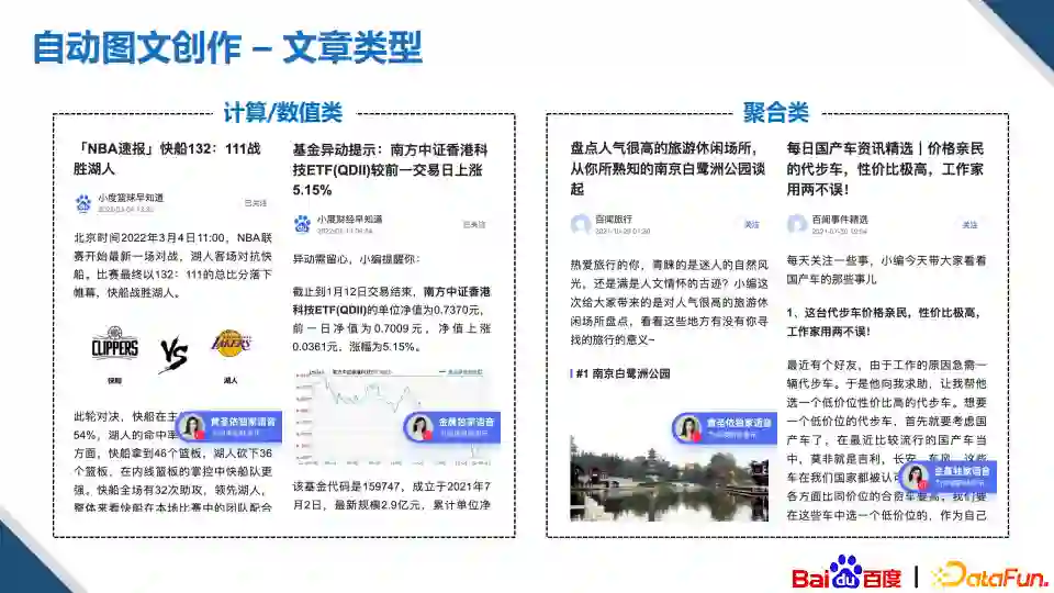 从我们目前已发布的文章类型来划分,这里列出了六大类常见的自动创作出的文章: * 第一类是计算/数值类,主要场景是天气、体育、股市等; * 第二类是聚合类,是通过素材不同纬度的理解,将相关的素材组织成文; * 第三类是浓缩类,就是将数千字的内容进行篇章级的摘要,同时要符合原内容的篇章逻辑; * 第四类是事件类,主要是对同一个主题事件的不同阶段进行回顾; * 第五类是分析类,主要是对同一个事件进行多维度分析其利弊,总结成文; * 第六类是视频转写,它将视频内容进行总结,从而形成一篇文章。