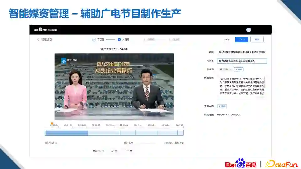 辅助创作的另外一个比较有价值的应用是媒资智能管理,简单来说就是帮助各个媒体进行视频的拆条、编目、标注的能力。拆条就是对一个完整的视频进行分割,像新闻联播,它可以分为很多的独立的片段,拆条的力度可以是片段级、场景级、镜头级;编目就是对拆条后的视频进行总结的描述。