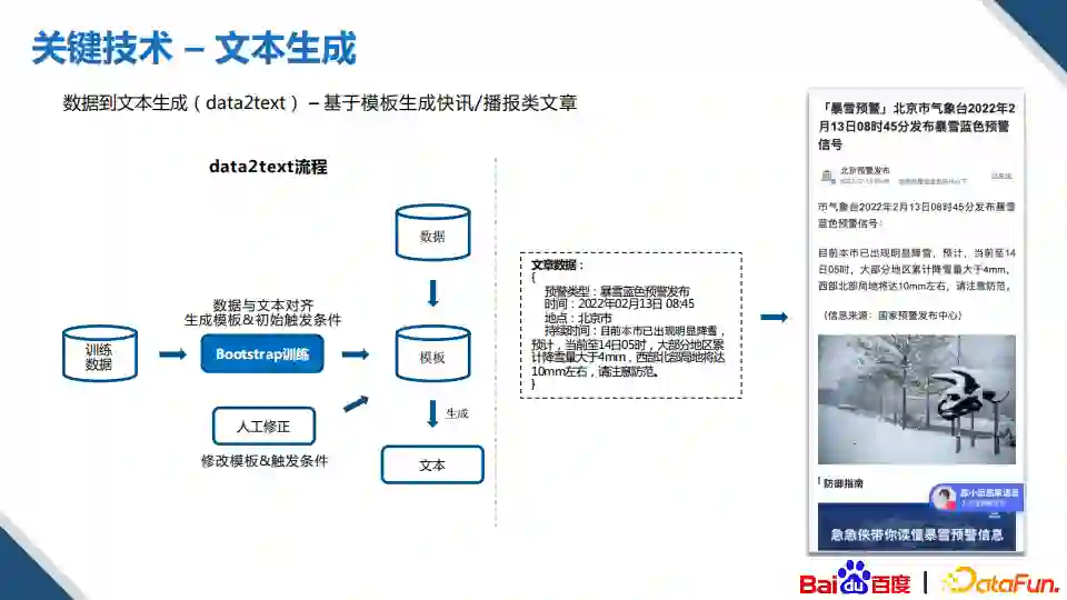 数据到文本生成,主要用在计算数值类的快讯文章,核心问题是如何去构建文章的模板。一般有三种方法:第一种是人工去构建初始的模板;第二种是从网上找到大量训练的数据,从中挖掘出对应的KV对信息,然后通过bootstrap的方式去训练;第三种是根据输入的KV对去直接生成,这种方案在短文案生成上的效果较好,但是在文章级的长文本生成上,目前还有很多问题。所以我们还是主要使用前两种方式去生成文章。
