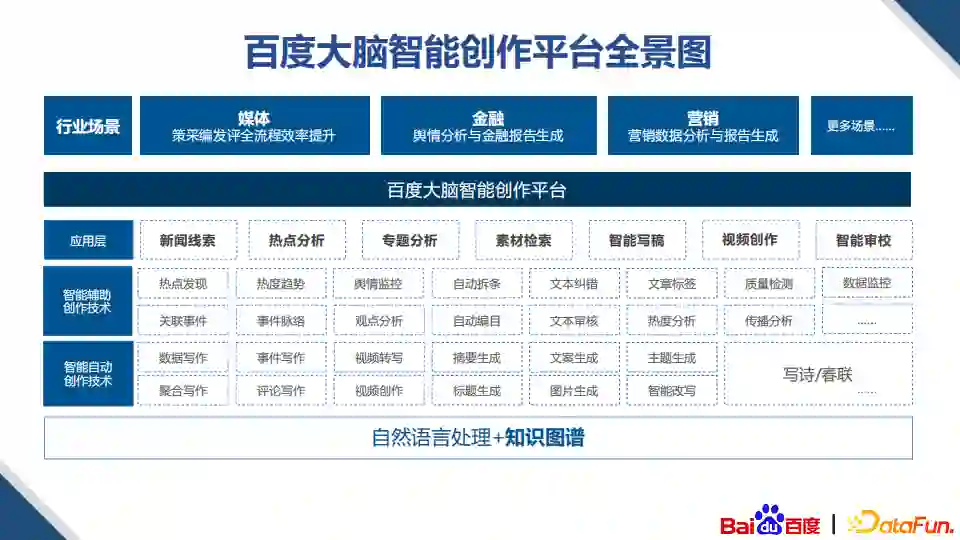 针对上述问题解决方案,可以简单总结为百度大脑智能创作平台全景图,基于NLP、知识图谱、视觉、语音的技术和数据,我们研发了智能自动创作和智能辅助创作的技术。在应用层提供包括新闻线索、热点分析、智能写稿、视频创作等核心的功能,可以满足各个行业创作的需求。下面会详细介绍每个功能的核心点: