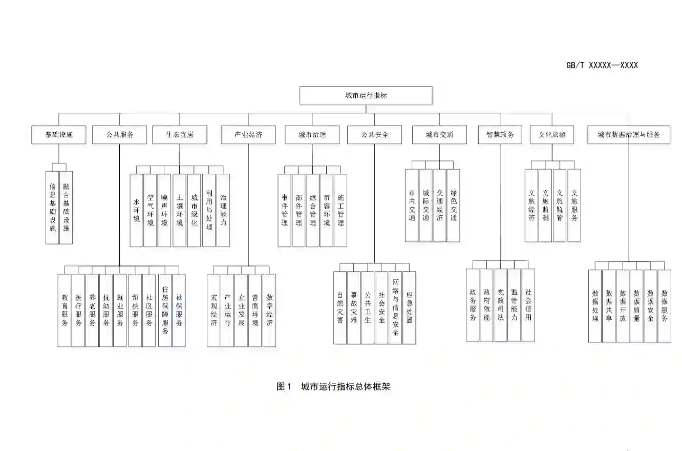 城市运行指标总体框架共包含10个一级指标分类、53个二级指标分类。每个二级指标分类下设多个指标项。如图所示:
