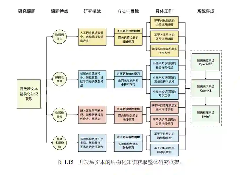 基于上述四方面工作,本文形成了开放域文本的结构化知识获取算法体系。围 绕该算法体系,本文也将从工程实现角度出发,介绍如何构建高效的知识应用系 统。上述算法与系统有利于进一步丰富知识图谱的知识规模,促进当前数据驱动 的深度学习善于刻画特征以及符号表示的结构化知识善于认知推理的双重优势结 合,对于揭示自然语言处理机理、实现智能语言理解具有重要意义。