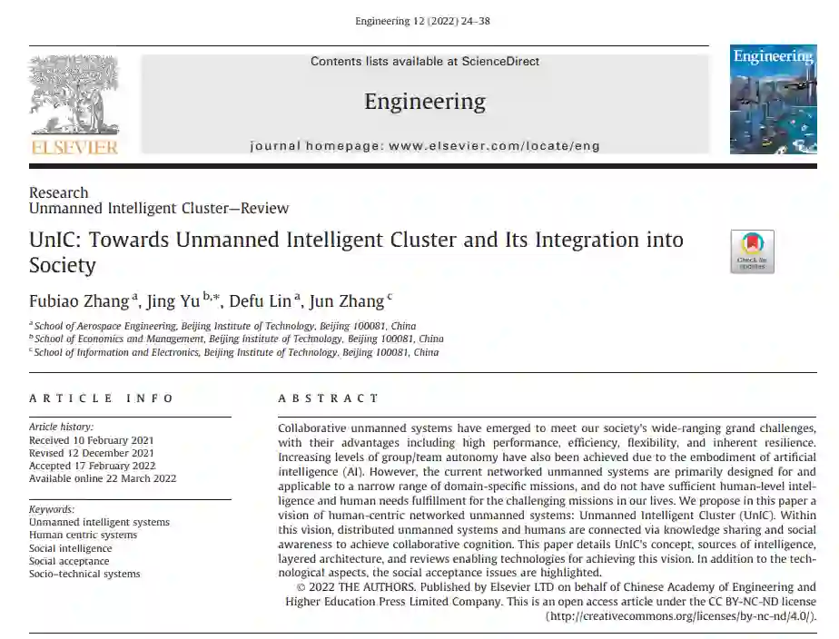 协作式无人系统以其灵活高效和内在抗毁的优势已经涌现,成为应对众多重大挑战的关键手段。尤其是借助人工智能(AI)的具象实现,无人系统达到了越来越高的集群自主水平。然而,目前的网联协作式无人系统主要是为狭窄的特定领域任务而设计,并只适用于这些任务。面对生活中具有挑战性的任务,仍无法以与人类智能相匹配的水平来充分满足人类的需求。本文提出了一个以人为本的网联无人系统的愿景:无人智群(Unmanned Intelligent Clusters, UnIC)。在这个愿景中,分布式无人系统和人类通过知识共享和社会情境连接起来,以实现协作认知。本文详细介绍了UnIC的概念、智能的来源、智群的分层结构,并综述了实现这一愿景的使能技术。除了技术方面,也从一般意义上关注了无人系统的社会接受问题。
