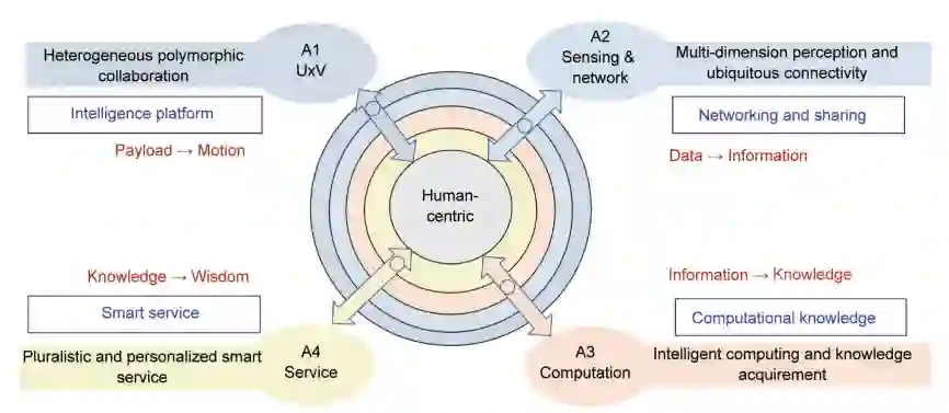 图4. UnIC的以人为本的分层结构。A1:无人系统平台(UxV)层;A2:传感和网络层;A3:计算层;A4:服务层