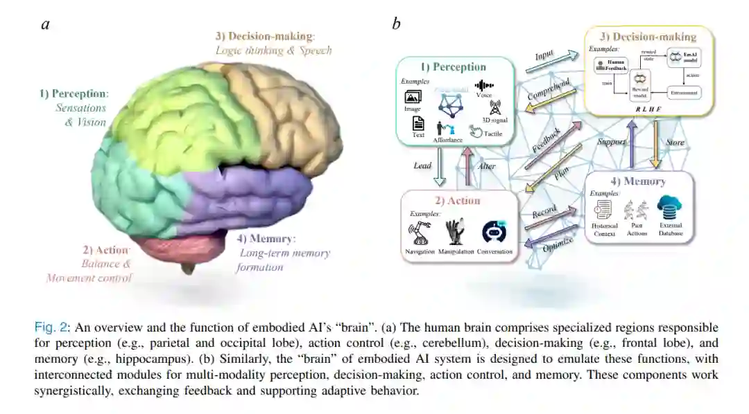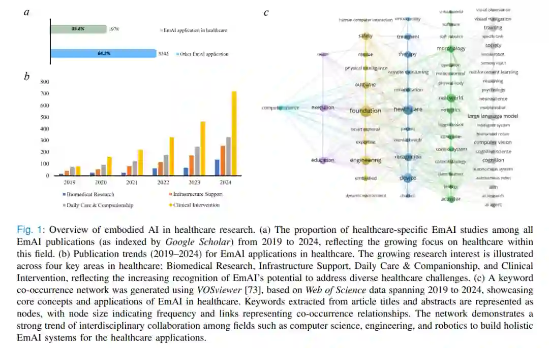 医疗服务在促进人类福祉方面发挥着基础性作用,但仍面临着持续的挑战,包括获取不平等 [1]、护理交付的低效率 [2],以及日益增长的个性化解决方案需求以应对复杂的医疗问题 [3], [4]。这些问题主要源于医疗资源的有限性和不均衡分布 [5],以及治疗方法的不够先进 [6],常常导致治疗延误、治疗不充分,或甚至过度治疗,从而加剧患者的病情 [7]。在当前的临床工作流中——主要依赖有限的临床基础设施、医护人员和护理人员——这些挑战仍然难以彻底克服。为了解决这些问题,已经实施了多种举措,例如远程医疗服务 [8], [9]、自动分诊系统 [10], [11]、AI辅助的健康监测 [12]、以及医学影像分析 [13], [14],这些举措提高了医疗获取的精确性和效率,同时推动了医疗领域的持续变革。然而,它们仍未能在现有的临床工作流中提供直接支持。 人工智能(AI)技术,特别是深度学习方法,正在为医疗实践引入新的“劳动力”,推动着医疗领域的持续变革 [15]–[21]。这些方法从多个中心、设备、场景、患者和时间点收集的广泛医疗数据中学习医学和诊断知识,利用电子健康记录(EHRs)、基因组序列、健康监测信号和医学影像等数据执行高级临床预测建模 [22], [23]。这使得早期诊断成为可能 [24],促进个性化治疗建议的形成 [25],发现人类难以察觉的细微病症 [26],并推动生物医学研究的进展 [27],共同提高了医疗服务的效率和质量。 然而,现代AI技术向实际临床利益的转化仍面临至少四个根本性挑战:(I)多模态处理不足。当前的AI系统主要依赖于视觉、语言和音频等常见模态,但通常缺乏处理触觉感知和嗅觉信号的能力,这两者在医疗中既复杂又至关重要。缺乏对这些较少探索模态的整合,限制了AI在应对临床任务和患者护理多方面问题中的有效性。(II)开发与部署的分离。当前的深度学习框架通常在开发和推理阶段之间有明显的分离,这阻碍了它们在实际临床环境中的持续演变。这种僵化的分离延迟了适应动态临床需求和不断变化环境的进程,最终限制了系统的持续自我改进能力。(III)人机交互功能不足。与患者和医护人员的有效互动对于提升患者体验甚至改善治疗结果至关重要。虽然先进的对话AI系统,如ChatGPT和GPT-4,展示了出色的互动能力,但它们通常未能与治疗目标对接,也没有扩展到行为互动层面。此类互动需要高级推理、强大的记忆保持能力和基于经验的适应能力。尽管近期研究已强调语言在治疗中的变革潜力 [28],但AI系统的语言和互动行为如何在临床结果上产生积极影响——特别是在心理健康治疗领域——仍未得到充分探索 [29], [30]。(IV)从决策到行动执行的路径缺失。没有具身于机器人或辅助设备中的AI系统,无法直接减轻医护人员和护理人员的工作负担。虽然当前的深度学习模型能够提供准确的诊断和决策支持,但很少将这些洞察转化为可执行的诊断或治疗干预措施。此外,在执行这些干预时确保安全,并保持与既定临床工作流的无缝整合,依然是需要紧急解决的关键挑战。 具身人工智能(EmAI)作为一种应对这些医疗挑战的有前景的方法正在崭露头角 [31]–[36]。通过将AI算法,尤其是多模态大语言模型(MLLMs)和世界模型,与机器人技术、机电一体化、人机交互和传感技术的创新结合,EmAI为AI算法提供了一个物理“身体”或有形介质,使其能够与世界直接互动 [37]。AI算法负责执行感知、行动控制、决策制定和记忆处理,确保EmAI系统的无缝运行。近年来,AI算法的若干突破显著推动了EmAI的发展。例如,无监督学习使得AI能够从海量数据中提取基础知识,而无需人工监督 [38]–[42];互动感知学习 [43] 使得EmAI系统能够理解物体的因果关系,并评估与不同物体互动的可能性和可行性 [44];跨模态融合技术已经广泛发展,能够整合并利用来自不同源的信息 [45], [46];深度强化学习使得AI系统能够通过环境反馈学习最优行为 [47]–[52];大语言模型(LLMs) [53]–[57]、多模态大语言模型(MLLMs) [58]–[63]、视觉-语言-行动(VLA)模型 [64]–[67],甚至世界模型 [68]–[70] 的进展,使得AI系统在沟通能力、推理能力和行动规划能力上得到了显著提升,尤其是在导航和操控等任务中 [71], [72]。得益于这些成就,“EmAI大脑”的发展和可用性得到了显著提升,使得在动态医疗环境中发挥作用的EmAI系统变得更加复杂、适应性强和具备上下文感知能力。 EmAI的进展正在推动各个领域的变革性应用,其中医疗保健作为领先领域,占据了该领域约35%的研究工作量 [27], [74],如图1(a)所示。显著的例子包括外科机器人 [75] 和陪伴机器人 [76],这些技术正在变得越来越普及。图1(b)展示了EmAI在医疗关键领域的显著增长,包括生物医学研究、基础设施支持、日常护理与陪伴以及临床干预。值得注意的是,2024年的总发表数量是2019年的近七倍,临床干预研究在这些领域中显示出了最快的增长,同时保持了较大的份额。这些成就得益于来自多个学科的知识融合。如图1(c)所示,关键词共现网络展示了各领域之间密集的相互联系,强调了跨学科合作在革命化医疗保健中的关键作用。来自基础模型、大语言模型、计算机视觉、认知科学、社会学和机器人技术的突破性贡献共同塑造了EmAI在医疗领域应用的未来。基于这些研究成果,EmAI正在通过提升患者护理和操作效率,深刻地改变医疗保健。它使得机器人诊断 [77]、精确外科干预 [78] 和