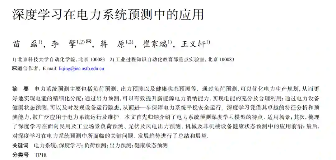 摘要: 电力系统预测主要包括负荷预测、出力预测以及健康状态预测等。通过负荷预测,可以优化电力生产规划,从而更好地实现电能的精细化分配;通过出力预测,可以有效提升新能源电力消纳能力,实现电能的充分及合理利用;通过电力设备健康状态预测,可以及时发现设备运行隐患,从而进一步保障电力系统平稳安全运行。深度学习凭借其卓越的特征分析和预测能力,被广泛应用于电力系统运行及维护。本文首先归纳介绍了电力系统预测深度学习模型的特点、适用场景;其次,梳理了深度学习在面向民用及工业场景负荷预测、光伏及风电出力预测、机械及非机械设备健康状态预测中的应用前沿;最后,对深度学习在电力系统预测中所面临的关键问题、发展趋势进行了总结和展望。