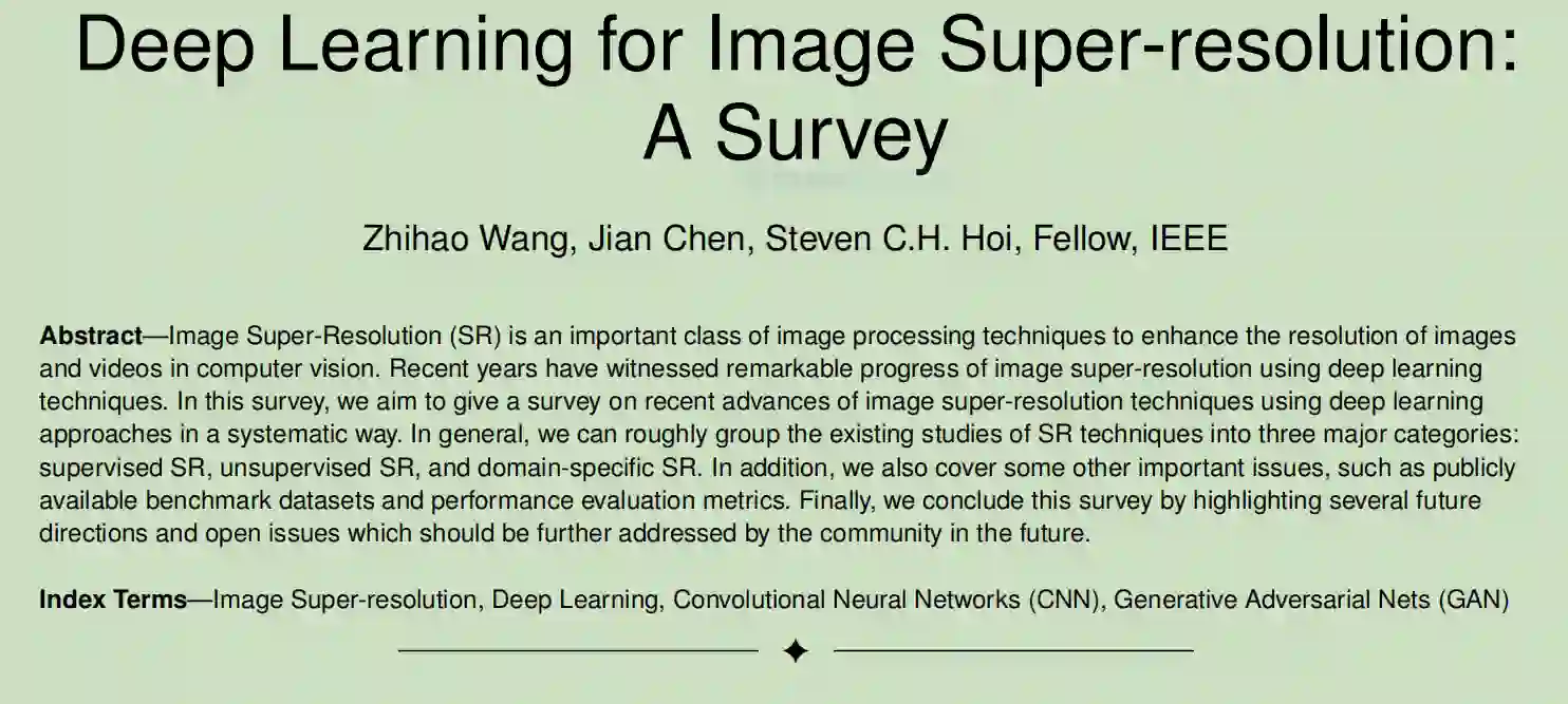 论文摘要: 图像超分辨率(SR)是提高图像分辨率的一类重要的图像处理技术以及计算机视觉中的视频。近年来,基于深度学习的图像超分辨率研究取得了显著进展技术。在这项调查中,我们旨在介绍利用深度学习的图像超分辨率技术的最新进展系统的方法。一般来说,我们可以粗略地将现有的SR技术研究分为三大类:监督SR、非监督SR和领域特定SR。此外,我们还讨论了一些其他重要问题,如公开可用的基准数据集和性能评估指标。最后,我们通过强调几个未来来结束这项调查未来社区应进一步解决的方向和公开问题.