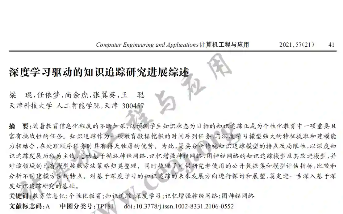 随着教育信息化程度的不断加深,以预测学生知识状态为目标的知识追踪正成为个性化教育中一项重要且富有挑战性的任务。知识追踪作为一项教育数据挖掘的时间序列任务,与深度学习模型强大的特征提取和建模能力相结合,在处理顺序任务时具有得天独厚的优势。为此,简要分析传统知识追踪模型的特点及局限性,以深度知识追踪发展历程为主线,总结基于循环神经网络、记忆增强神经网络、图神经网络的知识追踪模型及其改进模型,并对该领域的已有模型按照方法策略归类整理。同时梳理了可供研究者使用的公开数据集和模型评估指标,比较和分析不同建模方法的特点。对基于深度学习的知识追踪的未来发展方向进行探讨和展望,奠定进一步深入基于深度知识追踪研究的基础。