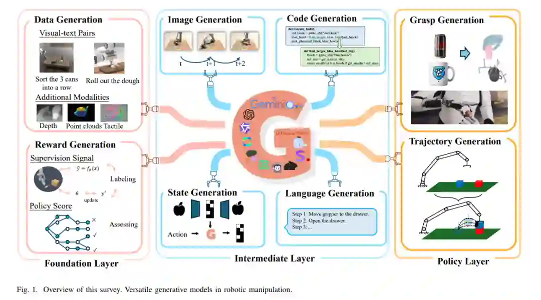 其次,长时程任务和复杂任务规划提出了重大挑战。复杂任务,如多步装配操作、杂乱环境中的物体重新排列以及与人类的协作任务[19],要求机器人规划并执行一系列相互依赖的动作。有效的规划需要复杂的建模技术,并通常假设环境的完全可观测性[20]。然而,在现实场景中,完全观测很少可行,因此需要代理对任务有内在理解,包括因果关系及其动作对环境的影响[9, 21]。传统的确定性模型由于无法充分表示长时程任务中的不确定性和动态交互,难以捕捉这种复杂性[22]。 生成式模型通过将复杂任务分解为可管理的子目标(如链式思维推理[23]),在解决长时程任务规划方面做出了重要贡献。利用语言生成和代码生成的能力,大规模生成式模型帮助机器人通过将复杂动作序列分解为更简单的步骤来规划任务[24, 25]。这种方法使代理能够生成明确的思维链和动作计划,增强其对复杂任务的理解和执行能力。通过结合这些生成技术,机器人能够更好地处理长时程任务中的不确定性和动态交互,从而提高其在操作场景中的整体性能。 此外,生成式模型通过开发世界模型和促进动态学习,增强了机器人对物理世界的理解。通过生成中间状态(如显式的视觉表示[26, 27]或隐式的潜在状态[28]),这些模型使机器人能够预测和规划环境中的未来事件。生成潜在未来状态的视觉能力改进了操作任务中的规划和决策过程。状态生成捕捉了准确执行任务所需的基本动态,解决了复杂环境中的不确定性和变异性。这使机器人能够在操作任务中预测并适应变化,从而提升其在动态环境中的表现。 第三,策略学习需要多模态推理能力。在机器人操作中,当前状态可能对应多个有效动作和结果,这是由于任务复杂性和环境变异性所致。例如,杯子可以通过把手或杯身抓取,最佳选择取决于后续任务:为杯子加水时抓取把手更合适,而将杯子递给他人时抓取杯身更佳。确定性模型通常将输入观测映射到单一输出,无法捕捉许多操作任务中固有的多模态特性。这种限制降低了适应性,并阻碍了在多样化情境中的表现。通过依赖一对一的映射,这些模型难以表示全部可能的动作范围,从而阻碍了更灵活和可泛化的机器人系统的开发。 生成式模型在策略学习方面展示了显著潜力,特别是在机器人操作任务中的抓取生成和轨迹生成方面[6, 29, 30, 31]。通过对整个轨迹的动作序列建模,生成式模型实现了控制策略的联合优化。例如,扩散模型已被应用于策略学习,能够生成平滑且可行的运动轨迹[29]。这些模型可以结合机器人操作空间中的固有约束,如生成三维空间中有效抓取姿态的SE(3)约束[8]。这种能力通过生成高效且物理上可行的策略,增强了机器人执行精确和复杂操作任务的能力。此外,它们对多模态分布的建模能力使其能够捕捉复杂操作任务中所需的多样化抓取姿态和运动轨迹。 B. 综述的结构概述 总之,生成式模型在机器人操作的多个层次上提供了解决方案:从基础的数据和奖励生成到高级的任务规划和策略建模。通过解决数据不足、复杂任务规划、低级控制和表示学习等关键挑战,生成式模型为更自主、高效和强大的机器人系统铺平了道路。已有一些综述探讨了与机器人和生成式模型相关的主题[3, 32, 33]。这些工作研究了机器人中的基础模型以及向通用人工智能的进展。然而,尚未有综述专门关注生成式模型如何解决机器人操作中的关键挑战。本综述聚焦于生成式模型在操作任务中的应用,试图提供一个统一且具体的视角,阐明生成式模型在不同层次上对机器人操作的作用。通过强调生成式模型在这些特定领域中的优势,我们旨在填补现有文献中的空白。图1展示了本综述所探讨方法的整体结构。 为系统理解生成式模型在机器人操作中的作用,我们将其应用分为三个层次:基础层、中间层和策略层。这一结构反映了从基础数据合成到高级决策再到低级控制的渐进流程。基础层专注于生成关键资源,如合成数据以扩充有限数据集和奖励信号以指导强化学习,构成模型训练和评估的支柱。在此基础上,中间层涵盖语言、代码、视觉和状态生成等任务,使机器人能够解释指令、处理感知数据并推理其环境,从而连接感知与动作。最后,策略层直接解决机器人操作的核心问题,包括抓取生成和轨迹规划,将较低层次的洞察转化为可操作的控制策略。这一分层框架突出了这些组件的相互依赖性,确保了机器人学习和控制的全面且可扩展的方法。