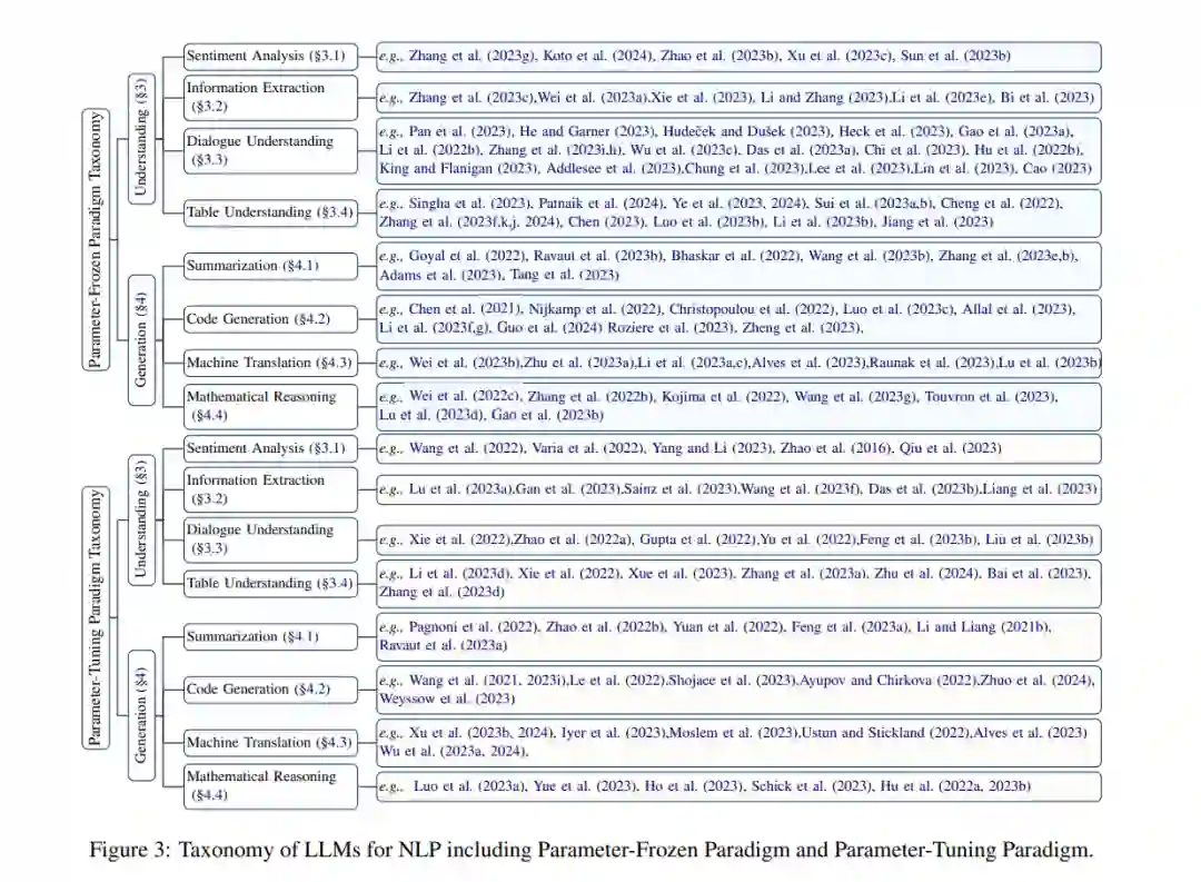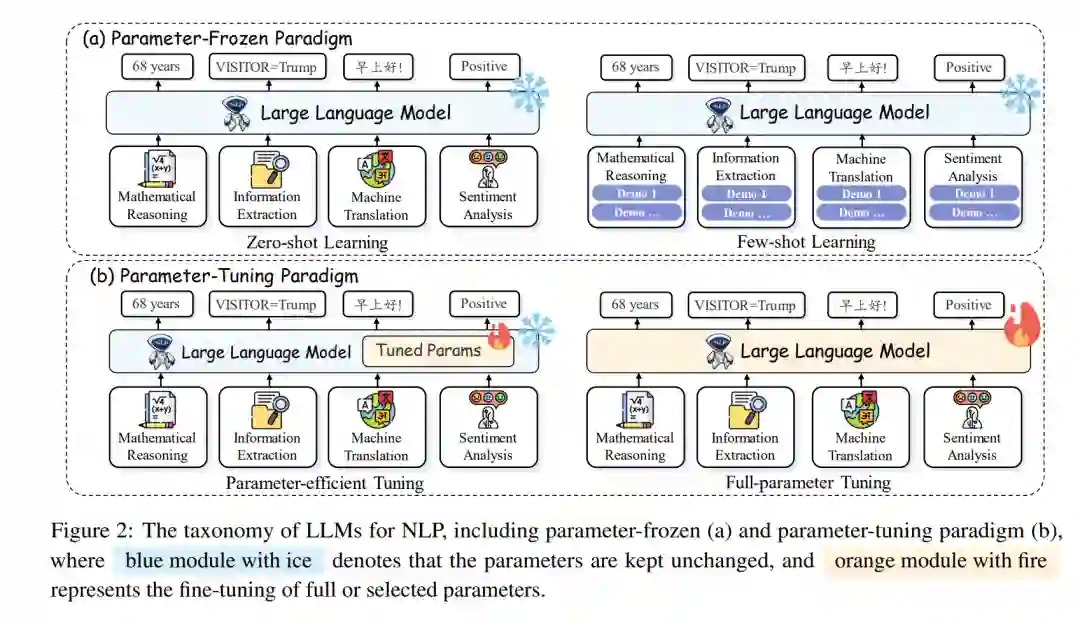 为了回答上述问题,我们首次尝试对LLMs在NLP中的应用进行全面而详细的分析。本工作的总体目标是探索LLMs在NLP中的当前发展。为此,在本文中,我们首先介绍相关背景和预备知识。此外,我们引入了LLMs在NLP中的统一范式:(1)参数冻结应用,包括(i)零样本学习和(ii)小样本学习;(2)参数微调应用,包括(i)全参数微调和(ii)参数高效微调,旨在提供一个统一的视角来理解LLMs在NLP中的当前进展: